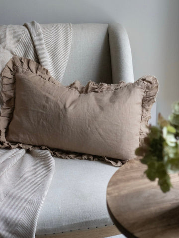 Introducing The Coffee Cushion with Ruffles. This cushion is made from a high quality linen and features a charming frayed edge. Enhance your home decor with this stylish wide striped cushion cover.