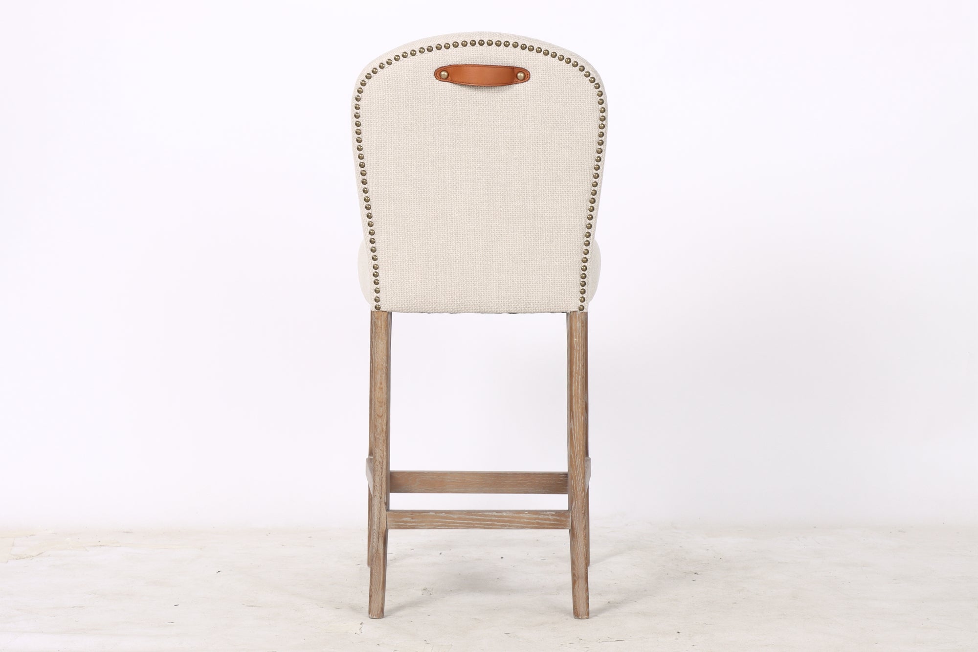 The Elm Counter Stool — a perfect blend of comfort, character, and craftsmanship. Featuring a plush, easy-clean fabric seat accented with antique brass studding, this stool brings timeless charm to any dining or kitchen space. The sturdy oak legs and practical leather handle add a rustic yet refined touch, making it as functional as it is stylish.