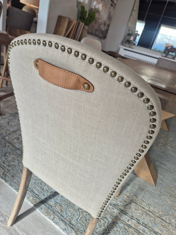 The Elm Counter Stool — a perfect blend of comfort, character, and craftsmanship. Featuring a linen blended fabric seat accented with antique brass studding, this stool brings timeless charm to any dining or kitchen space. The sturdy oak legs and practical leather handle add a rustic yet refined touch, making it as functional as it is stylish.