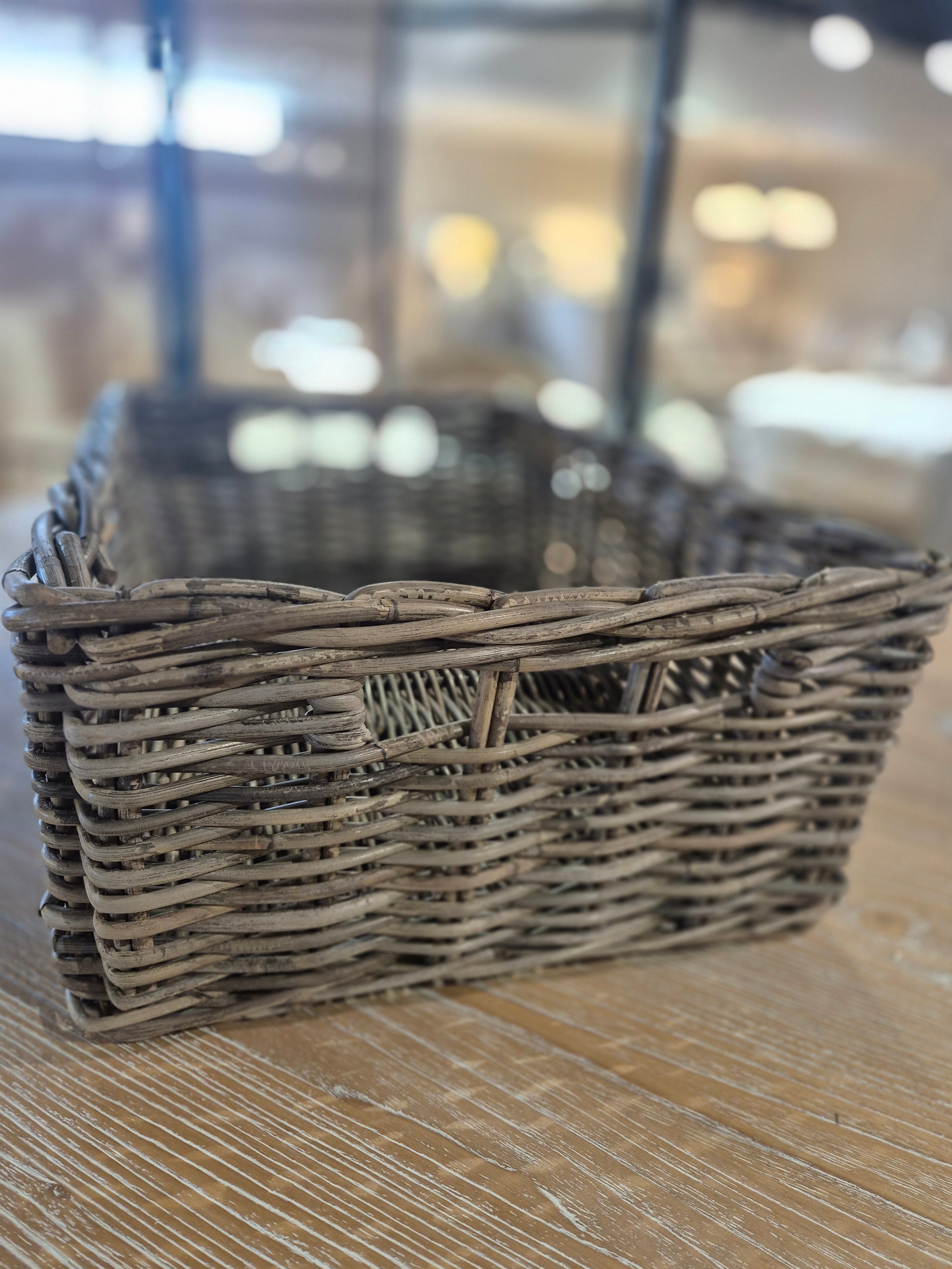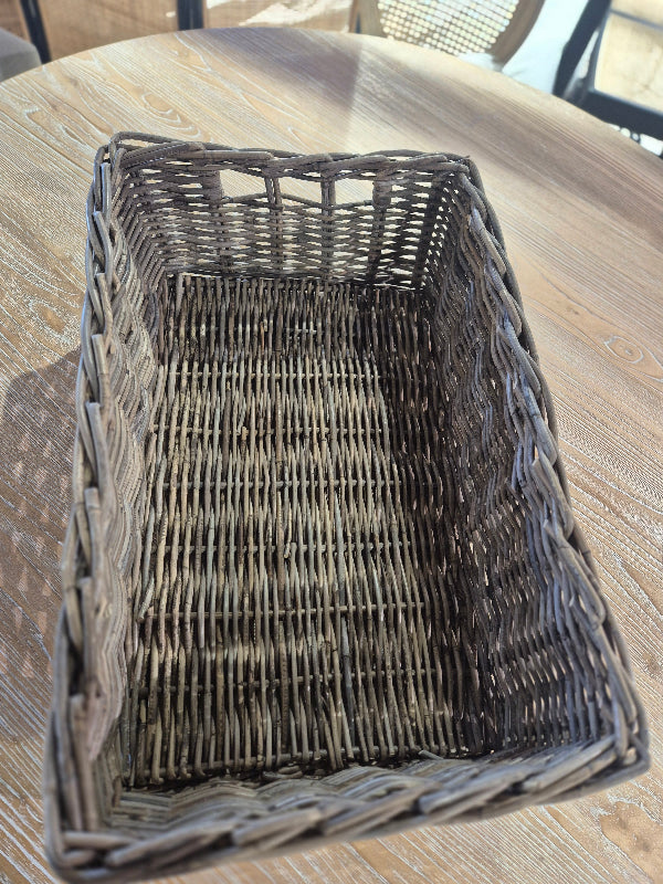 Experience the convenience and elegance of the Rectangle Basket with Cut Out Handles, crafted from high-quality rattan. Its stylish grey color and handmade construction add a touch of sophistication to any room. Carry and store your items with ease using the cut out handles.
