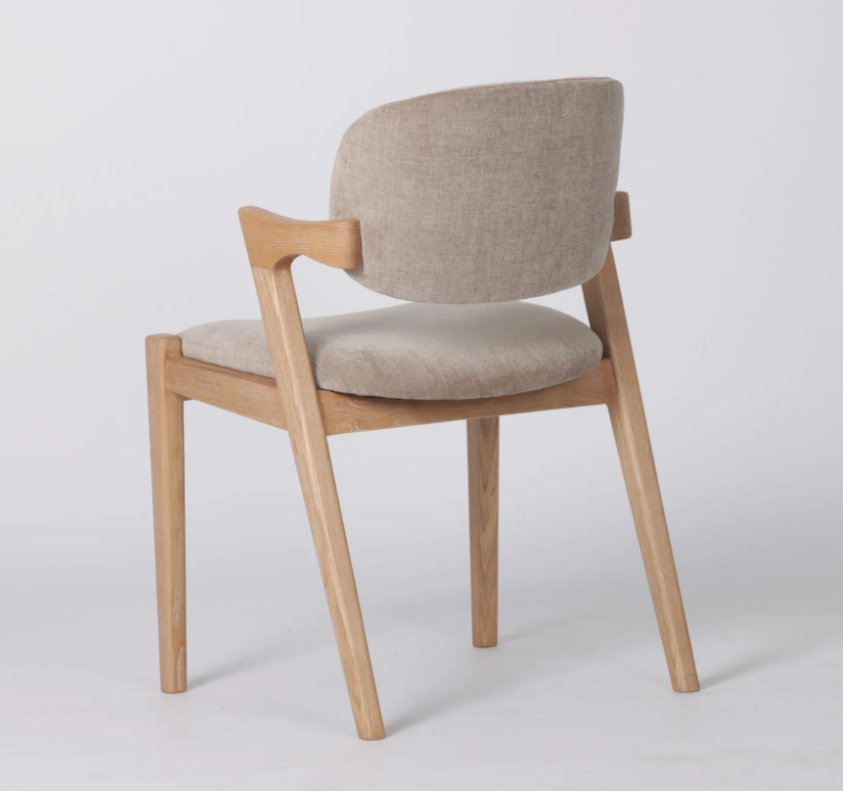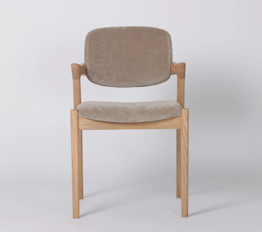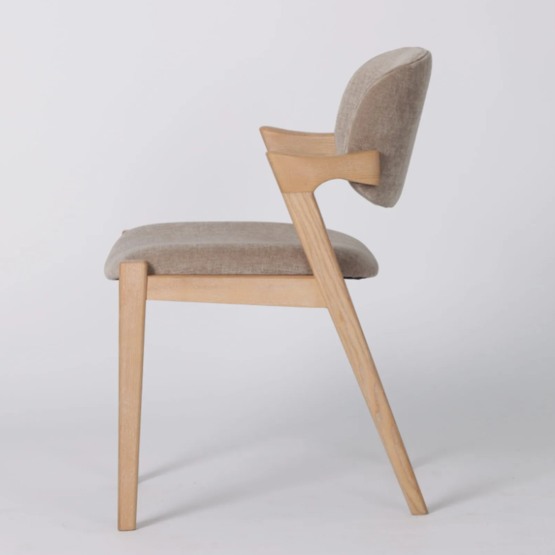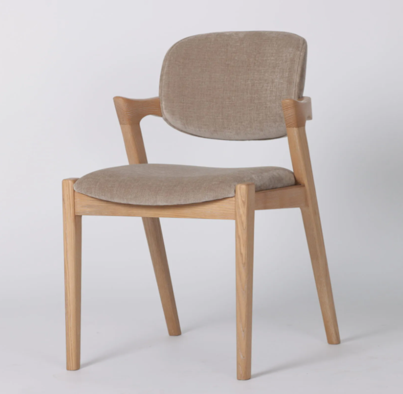 A modern dining chair upholstered in easy-clean mink fabric. With a 49cm seat height, it offers practical comfort for everyday use.