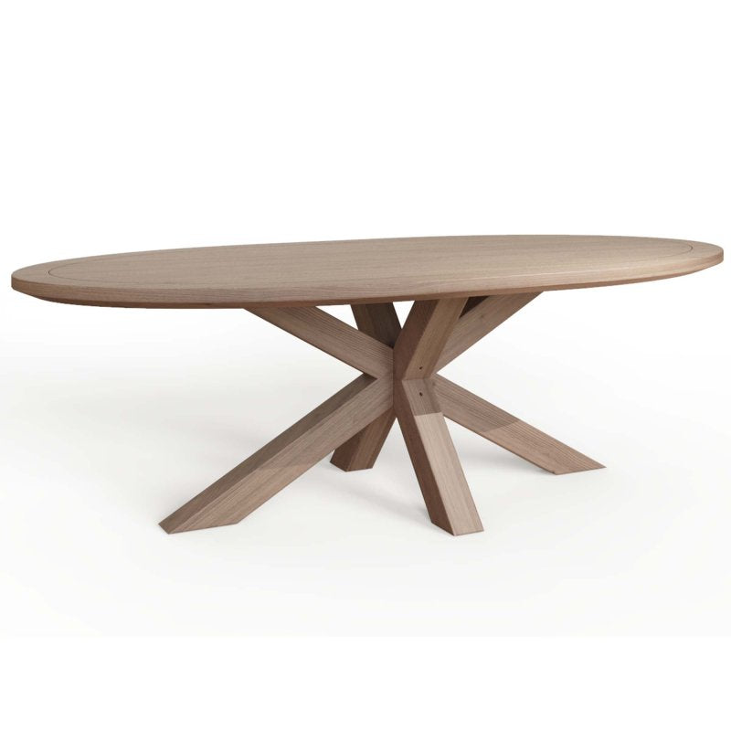 Beautiful oval table with solid wood, double cross legs and oak top in a grey oiled finish. A beautiful, contemporary dining table that will complement modern or traditional decor.