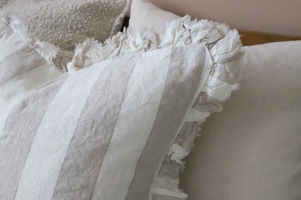 Add a touch of timeless charm to your space with our Natural Wide Stripe Ruffle Cushion.