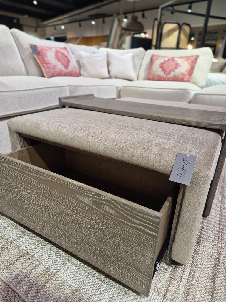 This beautifully crafted rectangular footstool is the perfect blend of comfort, style, and functionality. Upholstered in soft, textured aqua clean chenille with plush foam padding, it offers a cozy place to rest your feet while doubling as a sleek coffee table thanks to a cleverly integrated sliding tray. The solid oak drawers provide discreet storage, keeping your space tidy without compromising on design. Measuring 85 cm deep, 120 cm wide, and 40 cm high, it’s generously sized yet unobtrusive, making it a versatile centerpiece for any living room. Whether you're lounging with a book or hosting guests, this piece brings both elegance and practicality to your home.