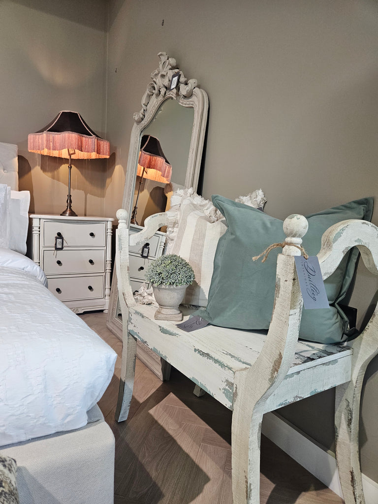 The White Distressed Stool is a stylish and versatile piece of furniture that can add a touch of farmhouse charm and rustic elegance to any living space. Its distressed white finish, curved legs, and minimalist design make it a timeless addition to any home.
