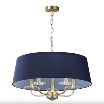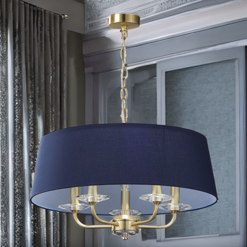 5 Light Stylo Satin Brass Pendant Navy Shade