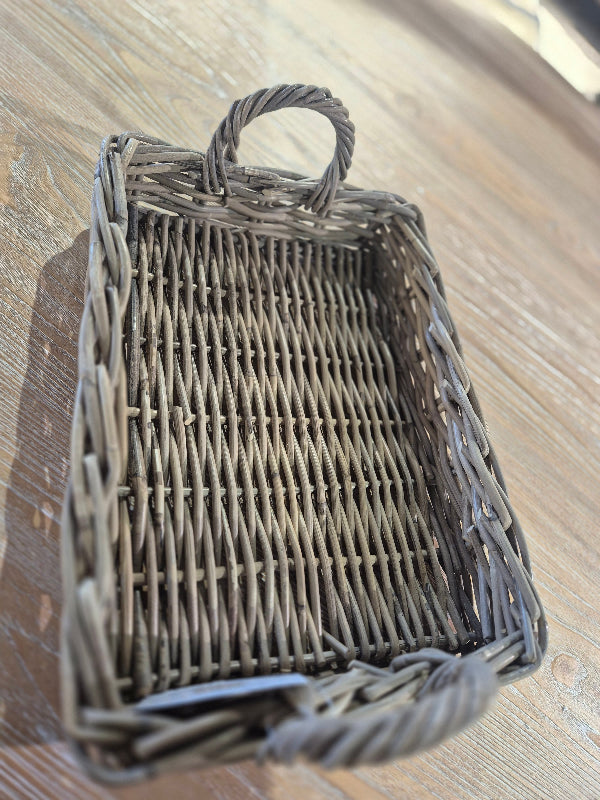 Elevate your home decor with our Rectangle Tray Basket! Hand-crafted from high-quality rattan, this grey basket features convenient ear handles for easy carrying and a sleek, modern design. Keep your space organized and stylish with this versatile and durable handmade product.