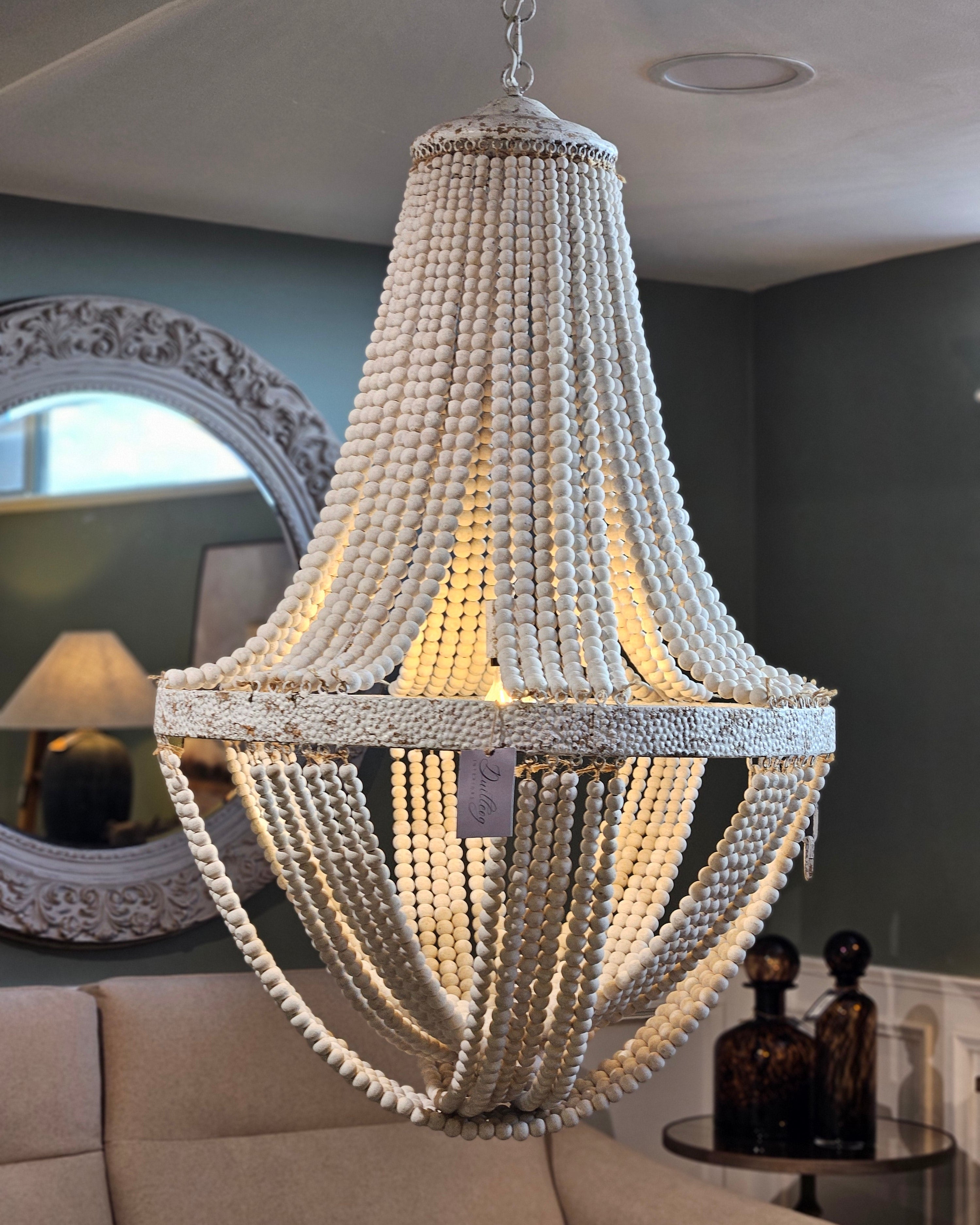 Bring a touch of rustic charm to your home with this stunning Large Wooden Beads Chandelier. Handcrafted from naturally distressed wood, this exquisite chandelier exudes an old-world elegance that will perfectly complement any farmhouse, cottage, or rustic décor style. The cascading arrangement of wood beads creates a mesmerizing visual effect, while the warm glow of your light bulbs casts a cozy and inviting ambiance. This chandelier is sure to become the focal point of any room, adding a touch of rustic elegance that will impress your guests and warm your heart.